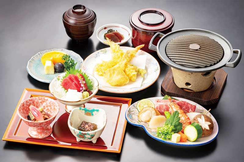 先付・お造り・焼物・炊き合せ・天麩羅・鉄板焼(又は鍋物)・茶碗蒸し・ご飯・赤だし・漬物・果物