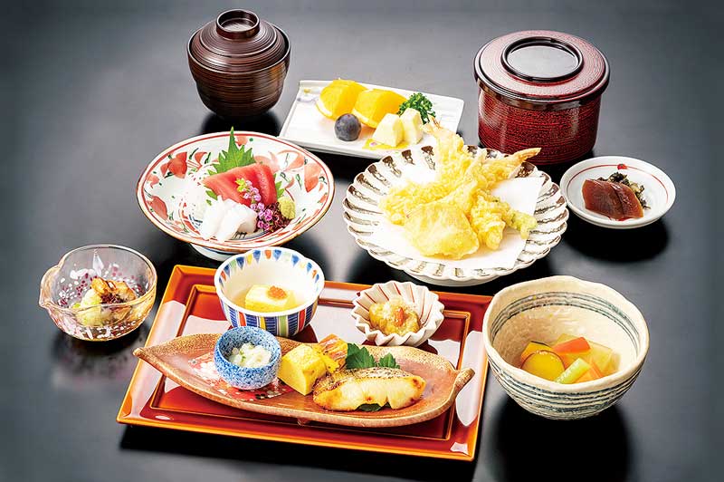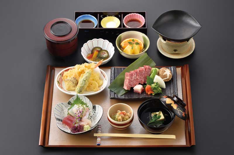 先付・お造り・焼物・炊き合せ・天麩羅・鉄板焼(又は鍋物)・茶碗蒸し・ご飯・赤だし・漬物・果物