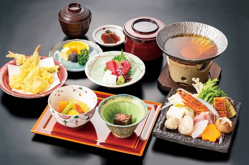 先付・お造り・天麩羅・炊き合せ・鍋物・ご飯・赤だし・漬物・果物
