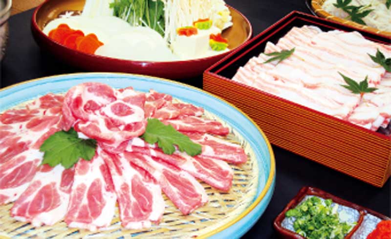 国内産豚肩ロース(100g)豚3枚バラ肉(120g)・野菜・稲庭うどん・特製鶏つみれ・小鉢・果物